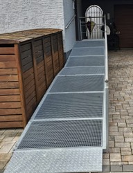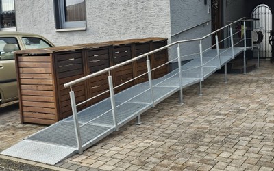 Regardless of whether it is a sidewalk edge, a stair landing, doorways with thresholds, height adjustment between levels, etc. With our tailor-made and standard-compliant ramps you will always drive safely, as side parts provide sufficient protection and flat slopes enable easy ascents and descents.   Weather resistance is very important to us. That's why we manufacture ramps in aluminum and only use non-rusting solid material for elements that are subject to higher loads, such as hinge pins, screw connections, etc. To ensure a high level of safety when driving on the ramps, the driving surface is made of non-slip materials such as corundum. Structured surfaces would also be conceivable. The edges of the ramps protect the wheelchair user from slipping. The drainage of rain or melt water is ensured by appropriate drainage options.   Railings are a.W. possible. The ends are bent downwards or sideways in accordance with standards.   The ramps are maintenance-free and their load capacity is tailored to the respective conditions. Intermediate platforms are possible. The gradient is tailored for universal applicability.   The ramps can be equipped with transport handles on request and, depending on the version, can be folded up or easily dismantled. Our portfolio includes ramps that can be adjusted in length, bridging height and incline. The lightweight construction enables energy-saving transport.   It is important for you to be able to use a suitable railing if necessary.   Our ramps are self-propelled and can therefore be safely navigated using arm strength alone.